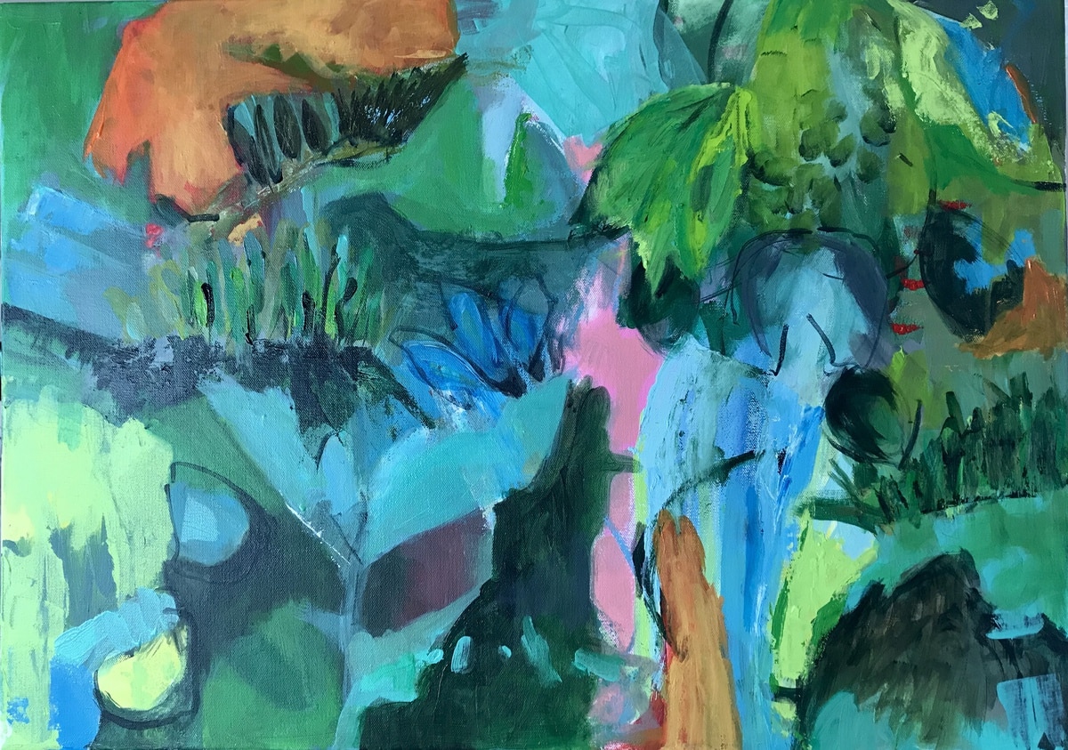 Jenny is a newbie to the Open Studios Gaucín but not a newbie to the village of Gaucín, where she lives since more than 6 years. This is her first appearance in the Open Studios. I really enjoy to see some new artist and their works. Jenny has a history of being a Goldsmith and a photographer. After following a small, a bit hidden and somewhat enchanted path we find her small studio, where she presents her paintings which are characterised by kind of geometric structures.