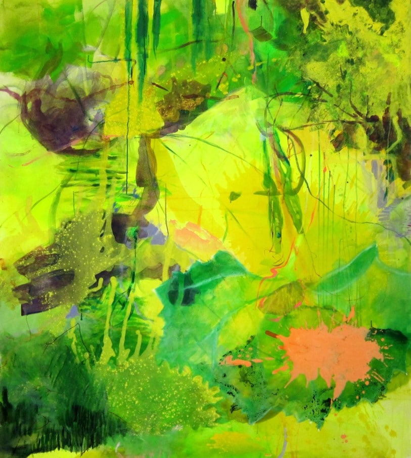 These is also a painting from my “Fluid Periode” which I looked at and I liked it but never felt it was finished. But as I liked the flow and the style and the colours , I didn’t want to destroy it, so I did only little changes, like deepening some darker parts, darken with a pink the very light part at the left and interrupt the light horizontal part by taking down a little bit the green. Very small differences that made a notable difference to me. Now it has become a harmonic painting for my taste. What do you think?